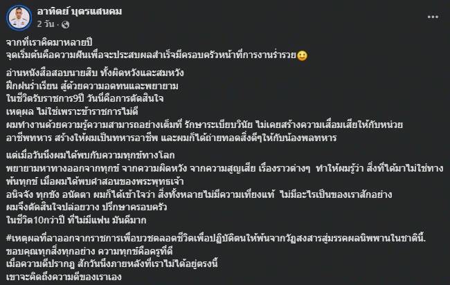 พร้อมกันนี้ จ.ส.ต.อาทิตย์ ยังได้เผยแพร่เรื่องราวชีวิตผ่านเฟซบุ๊ก อาทิตย์ บุตรแสนคม โดยเล่าย้อนถึงเส้นทางหลายปีที่ผ่านมา ที่ทุ่มเทแรงกายแรงใจไล่ตามความฝัน ตั้งใจศึกษาเล่าเรียน สอบบรรจุเป็นนายสิบ ผ่านทั้งความล้มเหลวและความสำเร็จ ฝึกฝนอย่างหนักจนได้ก้าวเข้าสู่เส้นทางรับราชการทหาร และปฏิบัติหน้าที่ต่อเนื่องยาวนานถึง 9 ปี ทั้งนี้ เจ้าตัวย้ำชัดว่าการลาออกไม่ได้เกิดจากความท้อแท้ต่อระบบราชการ แต่เป็นการเลือกทางเดินชีวิตใหม่ด้วยสติและเหตุผล