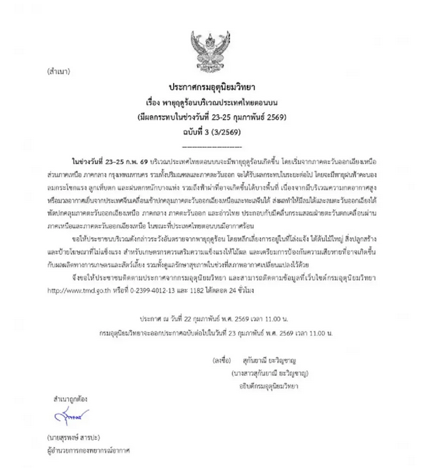 ประกาศ ณ วันที่ 22 กุมภาพันธ์ พ.ศ. 2569 เวลา 11.00 น. กรมอุตุนิยมวิทยาจะออกประกาศฉบับต่อไปในวันที่ 23 กุมภาพันธ์ พ.ศ. 2569 เวลา 11.00 น.