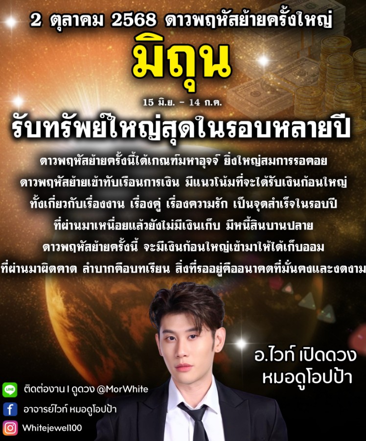โดย อาจารย์ไวท์ ทำนาย มิถุน (ผู้ที่เกิดระหว่างวันที่ 15 มิ.ย. -14 ก.ค.) รับทรัพย์ใหญ่สุดในรอบหลายปี