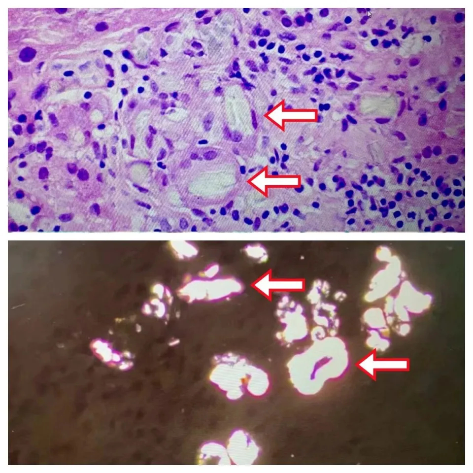 แพทย์ทำการตรวจชิ้นเนื้อ (biopsy) พบว่ามีเกล็ดออกซาเลตแคลเซียมจำนวนมากกระจายในท่อไต พร้อมมีการอักเสบรุนแรง จึงสรุปว่าเป็นโรค oxalate nephropathy หรือการที่ผลึกออกซาเลตแคลเซียมสะสมในเนื้อไต จนทำลายเนื้อเยื่อ และทำให้หน้าที่การกรองของไตด้อยลง