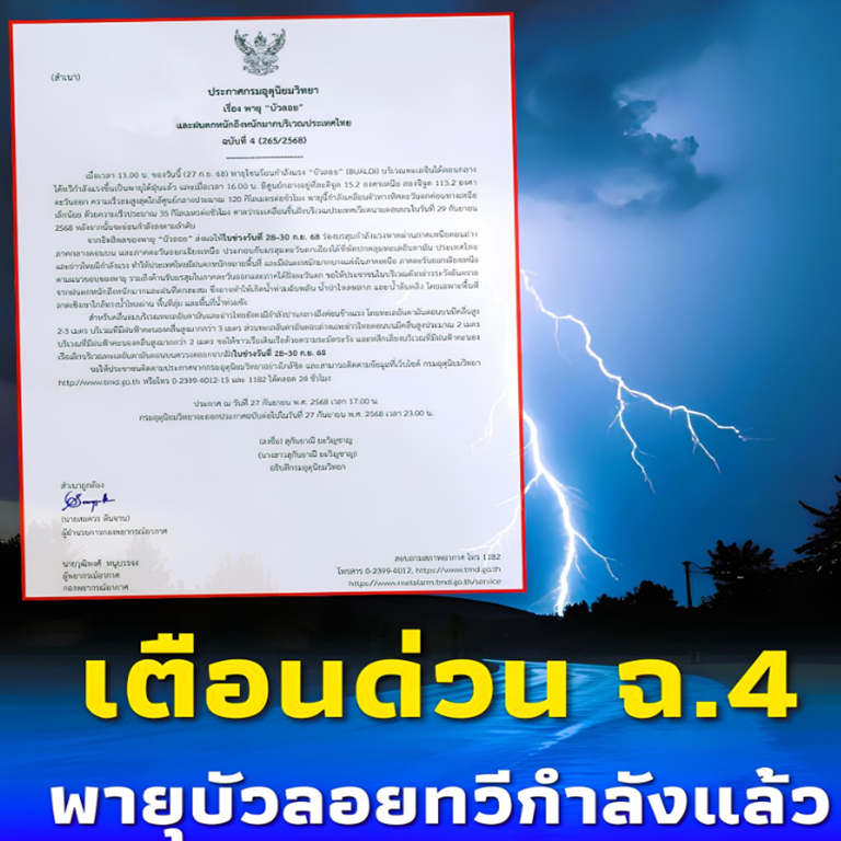 ประกาศกรมอุตุนิยมวิทยา เรื่อง “พายุบัวลอย” และฝนตกหนักถึงหนักมากบริเวณประเทศไทย ฉบับที่ 4 (265/2568)