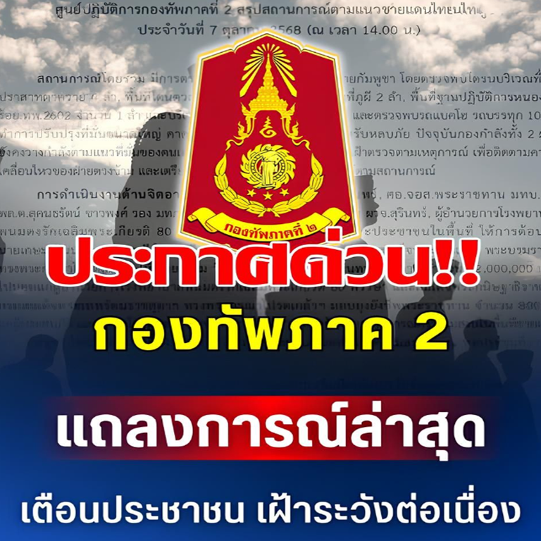 วันที่ 7 ตุลาคม 2568 ศูนย์ปฏิบัติการกองทัพภาคที่ 2 สรุปสถานการณ์ตามแนวชายแดนไทย-กัมพูชา (ณ เวลา 14.00 น.)