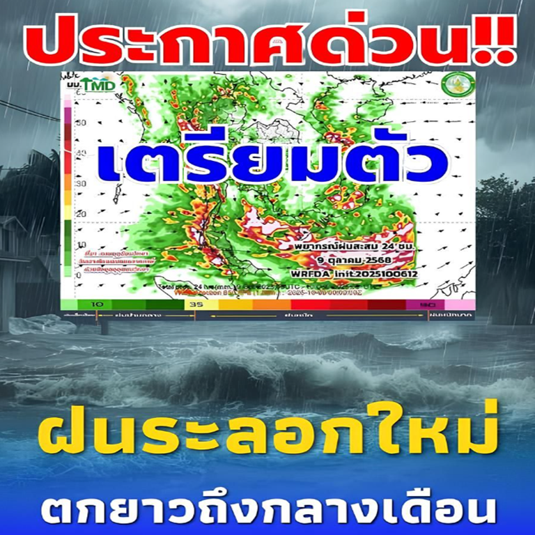 กรมอุตุ พยากรณ์อากาศ ประกาศ “ฝนระลอกใหม่” ตกยาวถึงกลางเดือน ช่วงวันที่ 9–16 ต.ค. 68 มีฝนกระจายทั่วไป บริเวณ ภาคกลางตอนล่าง ภาคอีสาน กรุงเทพฯ–ปริมณฑล และเริ่มมีสัญญาณมวลอากาศเย็น เข้าสู่ช่วง ปลายฝนต้นหนาว