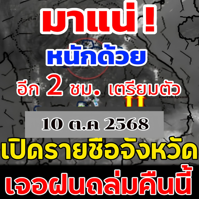 10 ตุลาคม 2568 พยากรณ์อากาศ 24 ชั่วโมงข้างหน้า ภาคกลาง รวมทั้งกรุงเทพมหานครและปริมณฑล ภาคตะวันออก และภาคใต้ฝนเพิ่มขึ้นกับมีฝนตกหนักบางแห่ง ทั้งนี้เนื่องจากร่องมรสุมเลื่อนลงมาพาดผ่านภาคกลางตอนล่าง และภาคตะวันออก ประกอบกับมรสุมตะวันตกเฉียงใต้พัดปกคลุมทะเลอันดามัน ภาคใต้ และอ่าวไทย ขอให้ประชาชนในบริเวณดังกล่าวระวังอันตรายจากฝนตกหนักไว้ด้วย ส่วนภาคเหนือและภาคตะวันออกเฉียงเหนือมีฝนลดลง