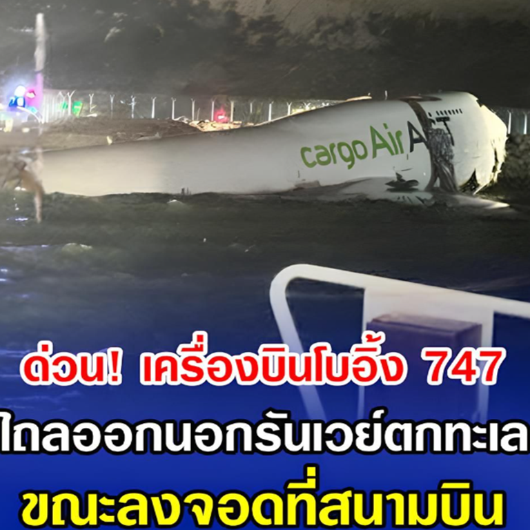 ด่วน!! เครื่องบินโบอิ้ง 747 ไถลออกนอกรันเวย์ตกทะเล ขณะลงจอดที่สนามบิน