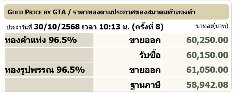 สำหรับราคาทองคำเปิดตลาดประจำวันที่ 30 ตุลาคม 2568 เปิดตลาดปรับลง 1,000 บาท ในครั้งที่1 ต่อมามีการปรับขึ้น-ลงรวมแล้ว 8 ครั้ง โดยทองรูปพรรณขายออกบาทละ 61,050 ตามข้อมูลจากเว็บไซต์ของ สมาคมค้าทองคำ เมื่อเวลา 10.13 น.