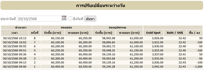 ราคาทองคำ วันที่ 30 ตุลาคม 2568