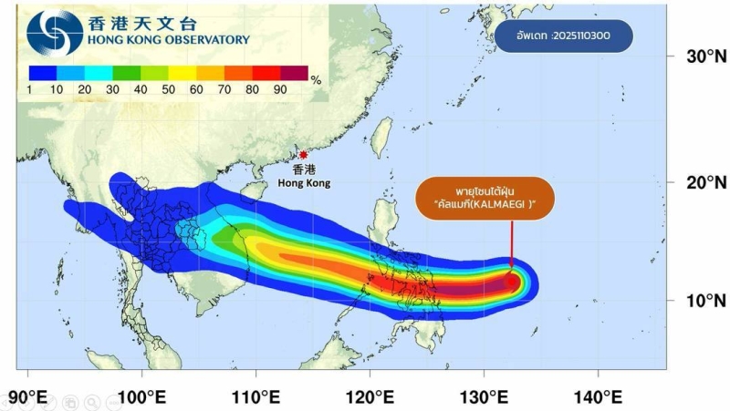 วันที่ 3 พ.ย. 2568 กรมอุตุนิยมวิทยา อัพเดทเส้นทางพายุ คัลแมกี ได้ทวีกำลังแรงเป็นพายุไต้ฝุ่นแล้ว กำลังเคลื่อนตัวทางตะวันตก คาดว่าจะเคลื่อนผ่านตอนกลางประเทศฟิลิปปินส์ ลงสู่ทะเลจีนใต้ ช่วง 4-5 พ.ย.68 และช่วง 7-9 พ.ย.68 จะเคลื่อนตัวเข้าใกล้ฝั่งประเทศเวียดนาม