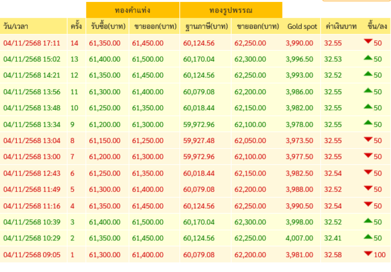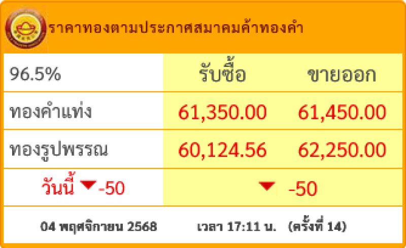 ราคาทองคำ วันที่ 4 พฤศจิกายน 2568 เวลา 17:11 น. ปรับครั้งสุดท้าย(ครั้งที่ 14)