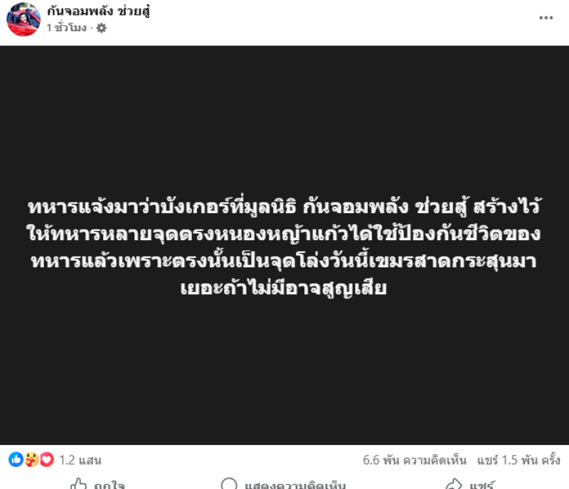 ทหารแจ้งมาว่าบังเกอร์ ที่มูลนิธิ กันจอมพลัง ช่วยสู้ สร้างไว้ให้ทหารหลายจุด ตรงหนองหญ้าแก้ว ได้ใช้ป้องกันชีวิตของทหารแล้ว เพราะตรงนั้นเป็นจุดโล่ง วันนี้เขมรสาดกระสุนมาเยอะ ถ้าไม่มีอาจสูญเสีย