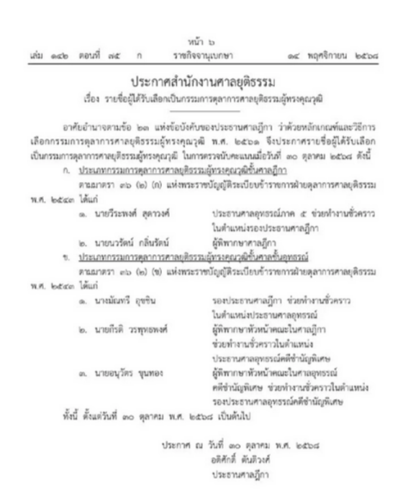 ราชกิจจานุเบกษา ประกาศรายชื่อผู้ได้รับเลือกเป็นกรรมการตุลาการศาลยุติธรรมผู้ทรงคุณวุฒิ ประจำปี ๒๕๖๘ โดยครอบคลุมทั้งกรรมการชั้นศาลฎีกาและศาลอุทธรณ์ พร้อมระบุวันเริ่มดำรงตำแหน่งตั้งแต่วันที่ ๓๐ ตุลาคมที่ผ่านมา เพื่อเสริมความเข้มแข็งและความโปร่งใสในการบริหารงานของศาลยุติธรรม