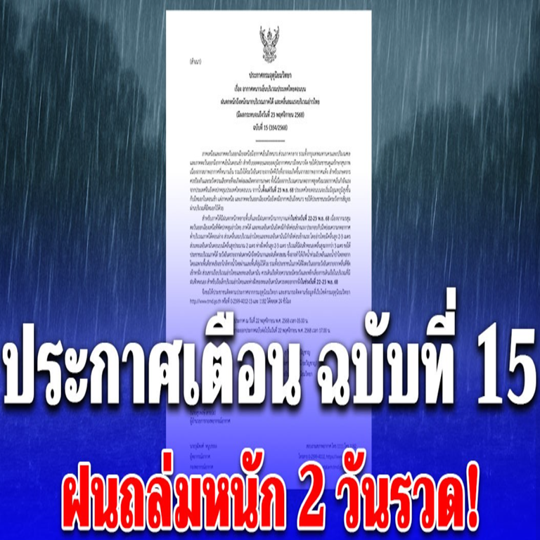 ประกาศกรมอุตุนิยมวิทยา เรื่อง อากาศหนาวเย็นบริเวณประเทศไทยตอนบน ฝนตกหนักถึงหนักมากบริเวณภาคใต้ และคลื่นลมแรงบริเวณอ่าวไทย (มีผลกระทบจนถึงวันที่ 23 พฤศจิกายน 2568) ฉบับที่ 15 (354/2568)