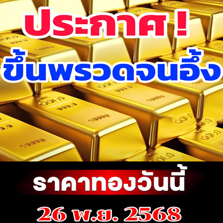 ราคาทองวันนี้ 26 พฤศจิกายน 2568 โดย สมาคมค้าทองคำ ประกาศราคาทองครั้งที่ (เปิดตลาด) เมื่อเวลา 09.07 น. เพิ่มขึ้น 150 บาท เมื่อเทียบกับราคาซื้อขายครั้งสุดท้ายของเมื่อวาน(อังคาร) ที่ระหว่างวันมีการประกาศราคาทองทั้งหมดมากถึง 30 ครั้ง รวมราคาปรับตัวเพิ่มขึ้น 600 บาท
