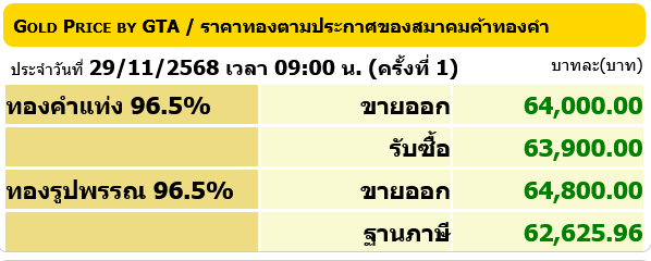 และปัจจุบัน ประกาศล่าสุด วันเสาร์ ที่ 29 พฤศจิกายน 2568 เวลา 09.00 น. ปรับขึ้น 400 บาท อยู่ที่