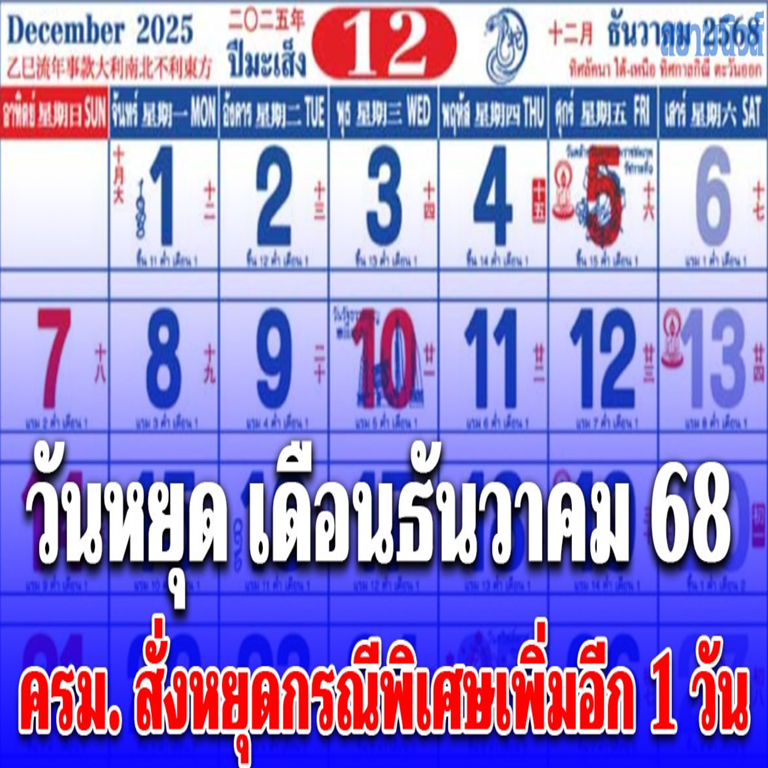 อึ้งทั้งประเทศ!! วันหยุด เดือนธันวาคม 68 ช่วงปีใหม่ 2569 ครม. สั่งหยุดกรณีพิเศษเพิ่มอีก 1 วัน