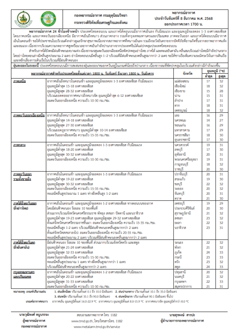 วันที่ 8 ธันวาคม 2568 กรมอุตุนิยมวิทยาได้พยากรณ์อากาศ 24 ชั่วโมงข้างหน้า ประเทศไทยตอนบน และภาคใต้ตอนบนมีอากาศเย็นลง กับมีลมแรง และอุณหภูมิจะลดลง 1-3 องศาเซลเซียส โดยภาคเหนือ และภาคตะวันออกเฉียงเหนือ มีอากาศเย็นถึงหนาว ส่วนภาคกลาง รวมทั้งกรุงเทพมหานครและปริมณฑล ภาคตะวันออก และภาคใต้ตอนบนมีอากาศเย็นในตอนเช้า