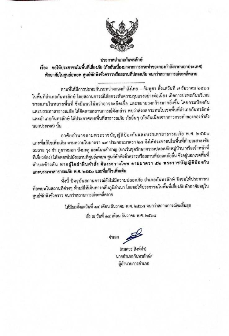 วันที่ 14 พ.ค. 2568 นายอำเภอกันทรลักษ์ ออกประกาศ เรื่อง ขอให้ประชาชนในพื้นที่เสี่ยงภัย (ภัยอันเนื่องมาจากการกระทำของกองกำลังจากนอกประเทศ) พักอาศัยในศูนย์อพยพ ศูนย์พักพิงชั่วคราวหรือสถานที่ปลอดภัย จนกว่าสถานการณ์จะคลี่คลาย