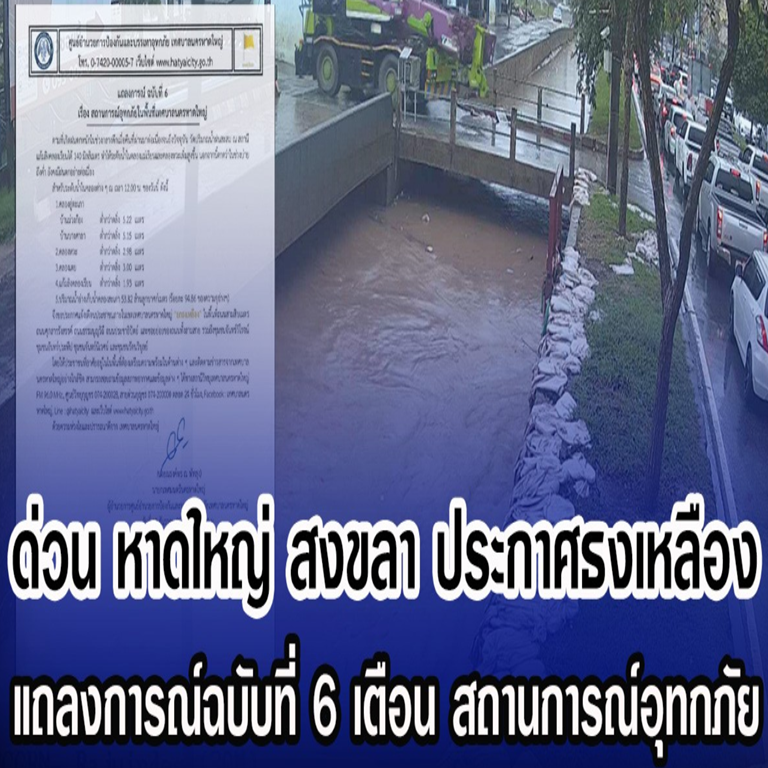 วันที่ 18 ธ.ค.2568 เทศบาลนครหาดใหญ่ ได้เผยแพร่แถลงการณ์ฉบับที่ 6 เรื่อง สถานการณ์อุทกภัยในพื้นที่เขตเทศบาลนครหาดใหญ่ ระบุว่า ตามที่เกิดฝนตกหนักในช่วงกลางคืนที่ผ่านมาต่อเนื่องจนถึงปัจจุบัน วัดปริมาณน้ำฝนสะสม ณ สถานีแก้มลิงคลองเรียนได้ 140 มิลลิเมตร ทำให้ระดับน้ำในคลองแม่เรียนและคลองหวะเพิ่มสูงขึ้น นอกจากนี้ คาดว่าในช่วงบ่ายถึงค่ำ ยังคงมีฝนตกอย่างต่อเนื่อง