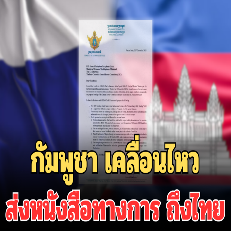 ล่าสุดเมื่อวันที่ 22 ธ.ค.68 กระทรวงกลาโหมกัมพูชา มีหนังสืออย่างเป็นทางการถึงรัฐมนตรีว่าการกระทรวงกลาโหมของไทย เพื่อแสดงความประสงค์ในการเจรจาหยุดยิง ซึ่งถือเป็นก้าวสำคัญภายใต้กรอบเงื่อนไขที่ไทยกำหนด