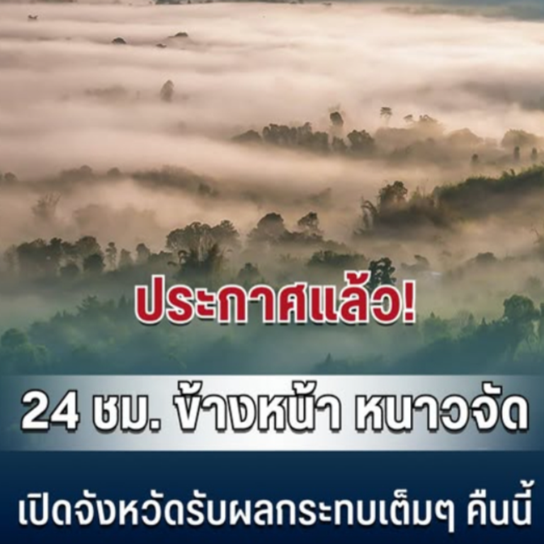 เมื่อวันที่ 12 มกราคม 2569 กรมอุตุนิยมวิทยา ได้รายงานพยากรณ์อากาศ 24 ชั่วโมงข้างหน้า ประเทศไทยมีอุณหภูมิสูงขึ้นกับมีหมอกในตอนเช้า แต่ยังคงมีอากาศหนาวเย็นบริเวณประเทศไทยตอนบน ส่วนภาคใต้ตอนบนมีอากาศเย็นในตอนเช้า เนื่องจากบริเวณความกดอากาศสูงหรือมวลอากาศเย็นกำลังค่อนข้างแรงที่ปกคลุมประเทศไทยตอนบนและภาคใต้ตอนบนมีกำลังอ่อนลง ขอให้ประชาชนดูแลรักษาสุขภาพเนื่องจากสภาพอากาศที่หนาวเย็น ระมัดระวังการเดินทางผ่านบริเวณที่มีหมอกและระวังอันตรายจากอัคคีภัยเนื่องจากสภาพอากาศแห้งไว้ด้วย< สำหรับภาคใต้ตอนล่างมีฝนเล็กน้อยบางแห่ง เนื่องจากมรสุมตะวันออกเฉียงเหนือกำลังปานกลางพัดปกคลุมอ่าวไทย ภาคใต้ และทะเลอันดามัน ส่วนคลื่นลมบริเวณอ่าวไทยและทะเลอันดามันมีกำลังปานกลาง โดยอ่าวไทยและห่างฝั่งทะเลอันดามัน มีคลื่นสูง 1-2 เมตร ขอให้ชาวเรือเดินเรือด้วยความระมัดระวังไว้ด้วย ฝุ่นละอองในระยะนี้ ประเทศไทยตอนบนมีการสะสมของฝุ่นละออง/หมอกควันอยู่ในเกณฑ์ปานกลางถึงค่อนข้างมาก และมีแนวโน้มการสะสมมากขึ้น เนื่องจากการระบายอากาศอยู่ในเกณฑ์ไม่ดี/อ่อน ภาคเหนือ อากาศเย็นถึงหนาวกับมีหมอกในตอนเช้า อุณหภูมิจะสูงขึ้น 1-3 องศาเซลเซียส อุณหภูมิต่ำสุด 12-16 องศาเซลเซียส อุณหภูมิสูงสุด 27-32 องศาเซลเซียส บริเวณยอดดอยอากาศหนาวถึงหนาวจัด อุณหภูมิต่ำสุด 4-10 องศาเซลเซียส ลมตะวันออกเฉียงเหนือ ความเร็ว 10-15 กม./ชม. ภาคตะวันออกเฉียงเหนือ อากาศเย็นถึงหนาวกับมีหมอกบางในตอนเช้า อุณหภูมิจะสูงขึ้น 1-3 องศาเซลเซียส อุณหภูมิต่ำสุด 10-16 องศาเซลเซียส อุณหภูมิสูงสุด 26-30 องศาเซลเซียส บริเวณยอดภูอากาศหนาวถึงหนาวจัด อุณหภูมิต่ำสุด 4-10 องศาเซลเซียส ลมตะวันออกเฉียงเหนือ ความเร็ว 10-20 กม./ชม. ภาคกลาง อากาศเย็นถึงหนาวกับมีหมอกบางในตอนเช้า อุณหภูมิจะสูงขึ้น 1-2 องศาเซลเซียส อุณหภูมิต่ำสุด 14-17 องศาเซลเซียส อุณหภูมิสูงสุด 28-30 องศาเซลเซียส ลมตะวันออกเฉียงเหนือ ความเร็ว 10-20 กม./ชม. ภาคตะวันออก อากาศเย็นถึงหนาวกับมีหมอกบางในตอนเช้า อุณหภูมิจะสูงขึ้น 1-2 องศาเซลเซียส อุณหภูมิต่ำสุด 16-21 องศาเซลเซียส อุณหภูมิสูงสุด 30-32 องศาเซลเซียส ลมตะวันออกเฉียงเหนือ ความเร็ว 15-35 กม./ชม. ทะเลมีคลื่นสูงประมาณ 1 เมตร ห่างฝั่งคลื่นสูง 1-2 เมตร ภาคใต้(ฝั่งตะวันออก) ตอนบนของภาค อากาศเย็นกับมีหมอกบางในตอนเช้า อุณหภูมิจะสูงขึ้น 1-3 องศาเซลเซียส ตอนล่างของภาค มีฝนเล็กน้อยบางแห่ง อุณหภูมิต่ำสุด 17-22 องศาเซลเซียส อุณหภูมิสูงสุด 28-32 องศาเซลเซียส ลมตะวันออกเฉียงเหนือ ความเร็ว 15–35 กม./ชม. ทะเลมีคลื่นสูง 1-2 เมตร ภาคใต้(ฝั่งตะ