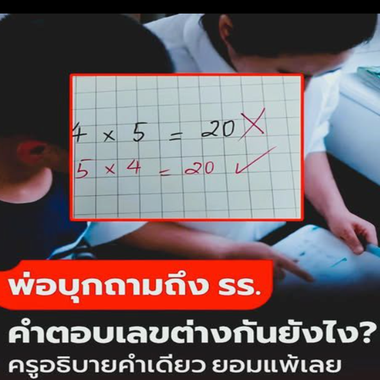 สุดท้ายคุณพ่อคนนี้ตัดสินใจไปสอบถามคุณครูถึงโรงเรียน หลังจากได้รับฟังความคับข้องใจของผู้ปกครองแล้ว ครูประจำชั้นก็ยิ้มแล้วจึงอธิบายอย่างใจเย็นว่า “หน่วยนี้ถามจำนวนคน เลยต้องใช้จำนวนคนคูณ ไม่ใช่จำนวนแถวที่จะคูณ คำตอบที่ถูกต้องก็สำคัญ แต่สิ่งสำคัญมากกว่าคือ นักเรียนเข้าใจปัญหาอย่างชัดเจน ในระดับผู้ใหญ่ 4×5 หรือ 5×4 ก็ไม่แตกต่างกัน แต่ในการเรียนระดับประถมศึกษา การคำนวณนี้จะต้องเป็น 5×4”
